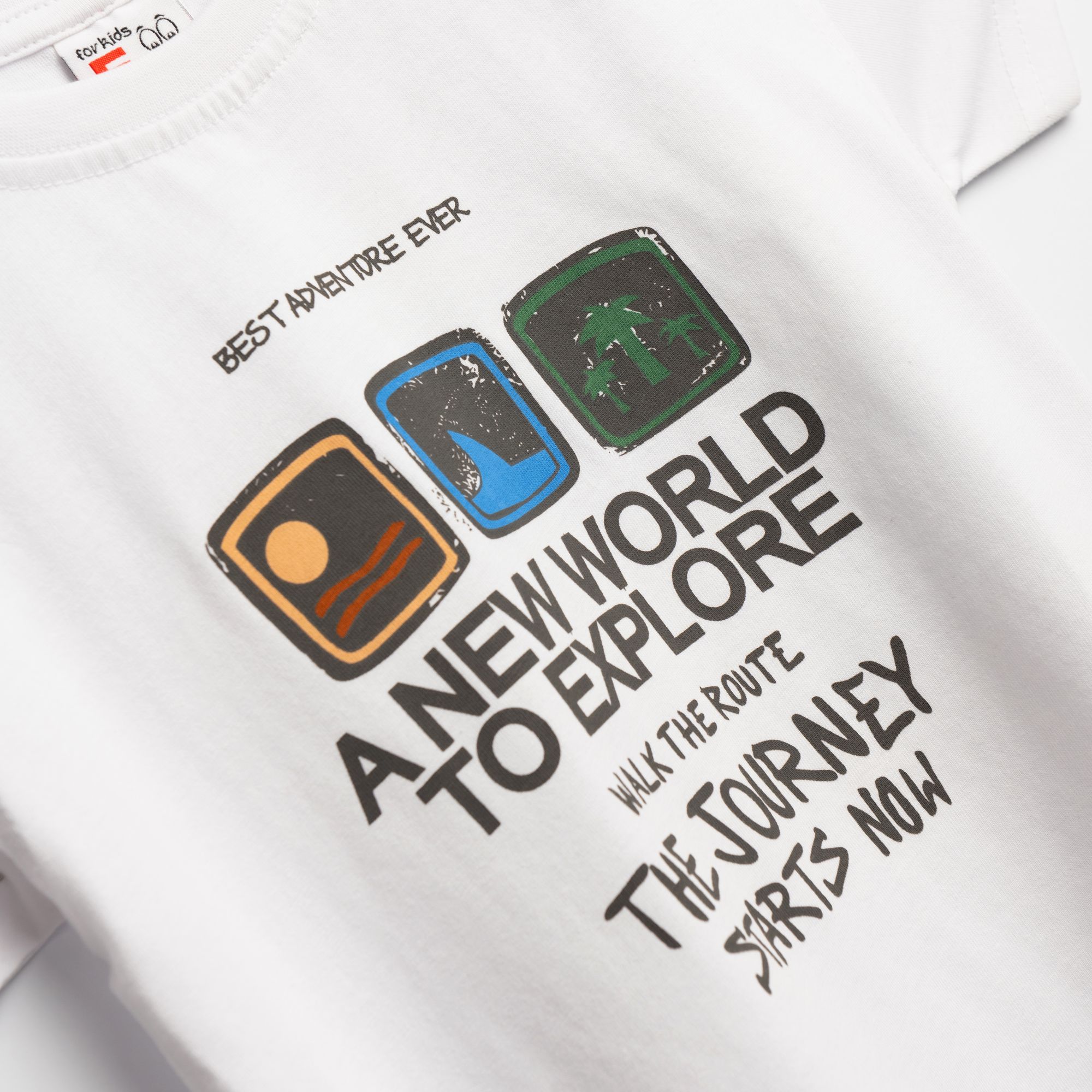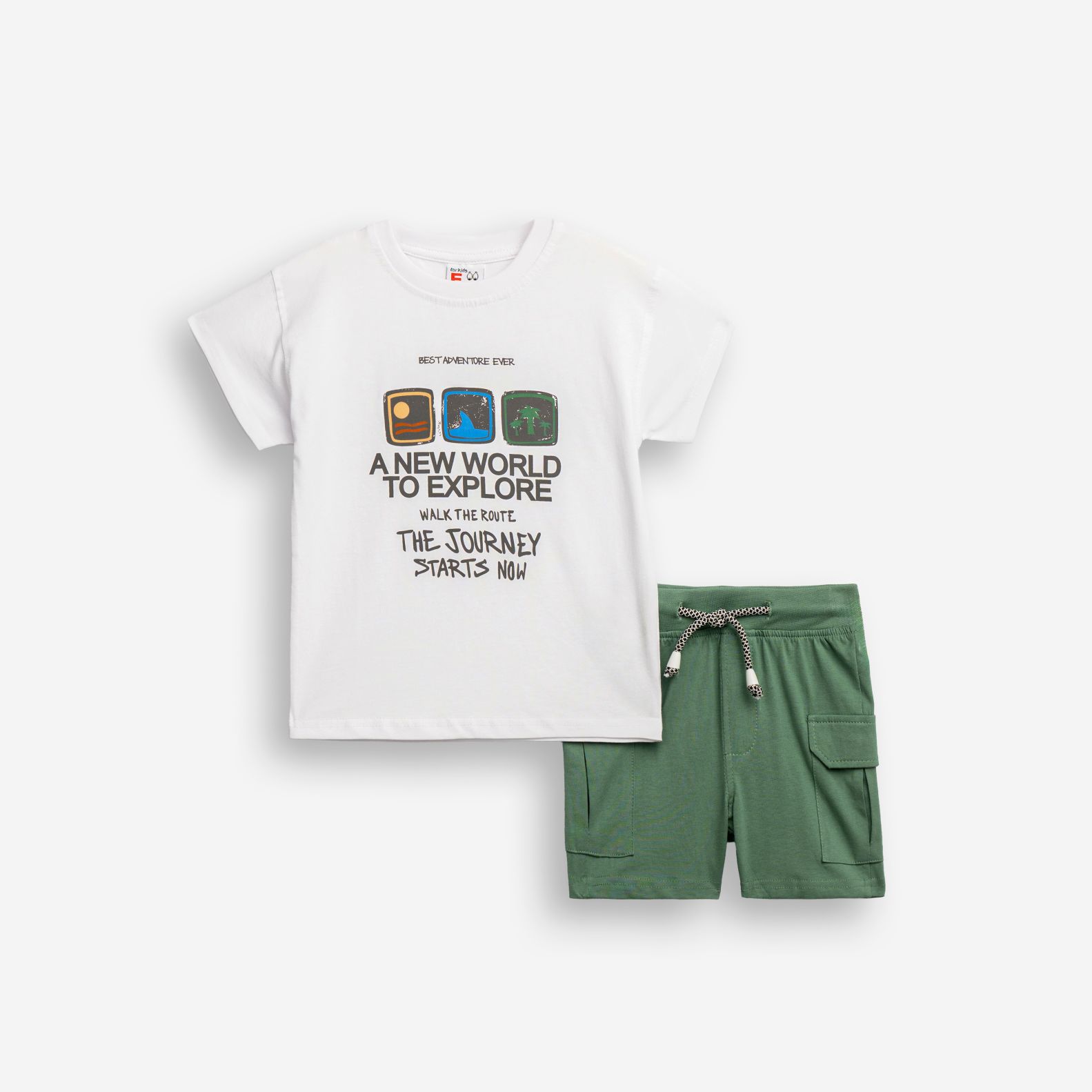 Σετ μπλούζα μακό με τύπωμα (new world to explore) και βερμούδα με τσέπες πάνω από το γόνατο σε χρώμα λευκό/garden για αγόρι 2-6 ετών