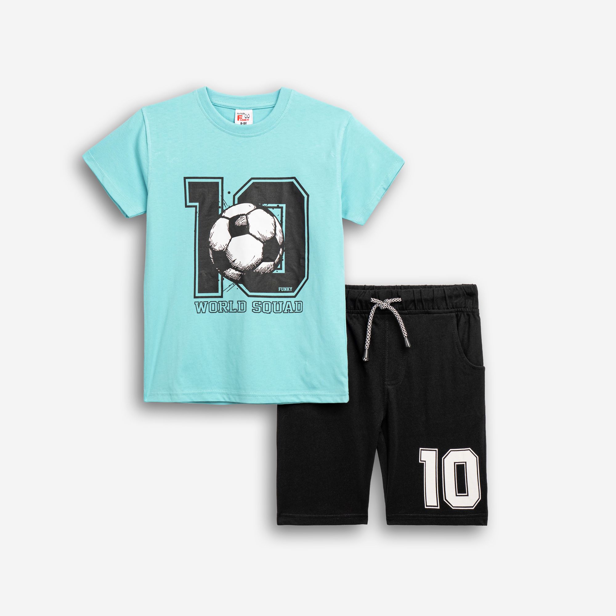 Σετ μακό κοντομάνικη μπλούζα με τύπωμα (world squad 10) και βερμούδα με τύπωμα σε χρώμα τυρκουάζ/μαύρο για αγόρι 6-12 ετών