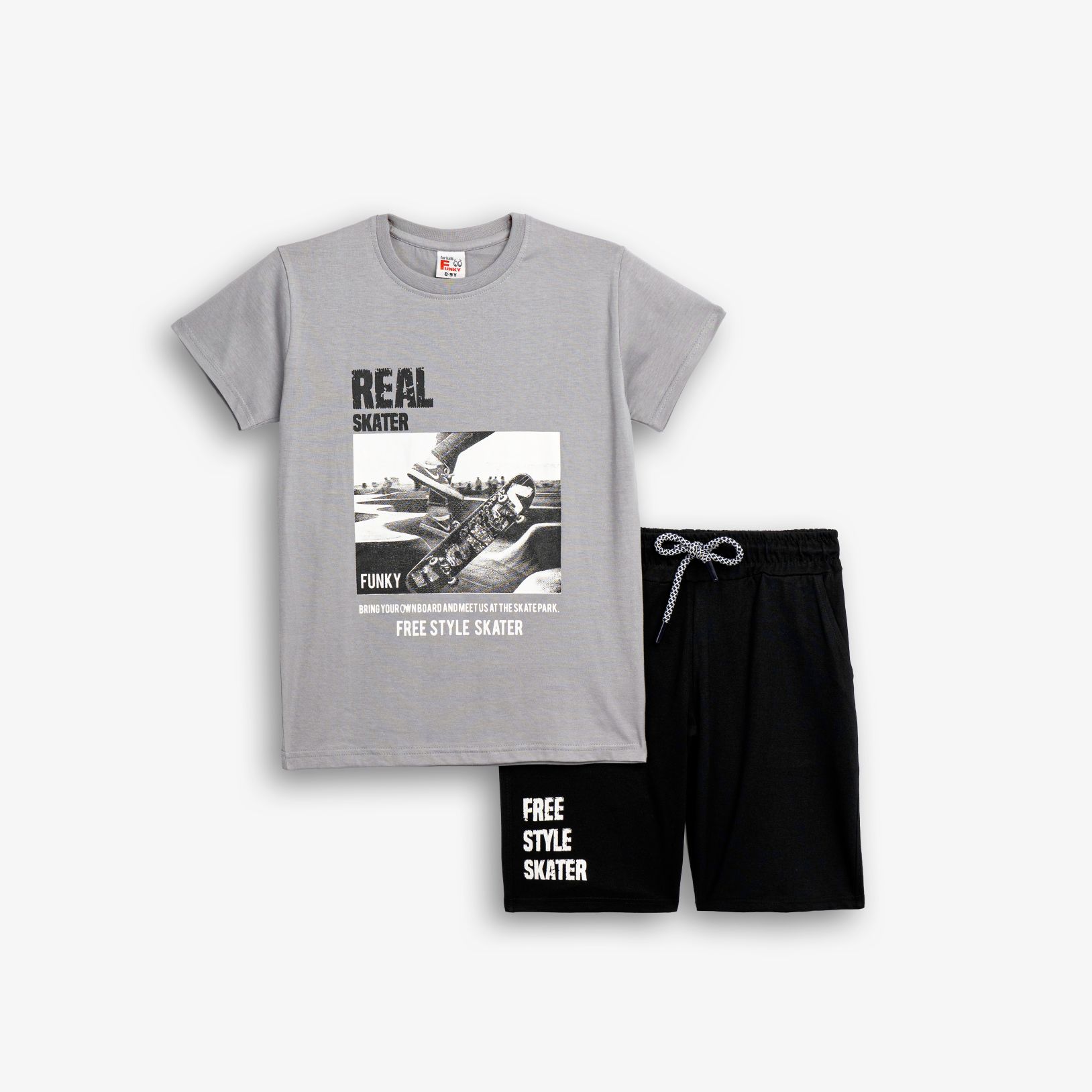 Σετ κοντομάνικη μπλούζα με τύπωμα (real skater) και βερμούδα φούτερ με τύπωμα σε χρώμα mirage grey/μαύρο για αγόρι 6-16 ετών
