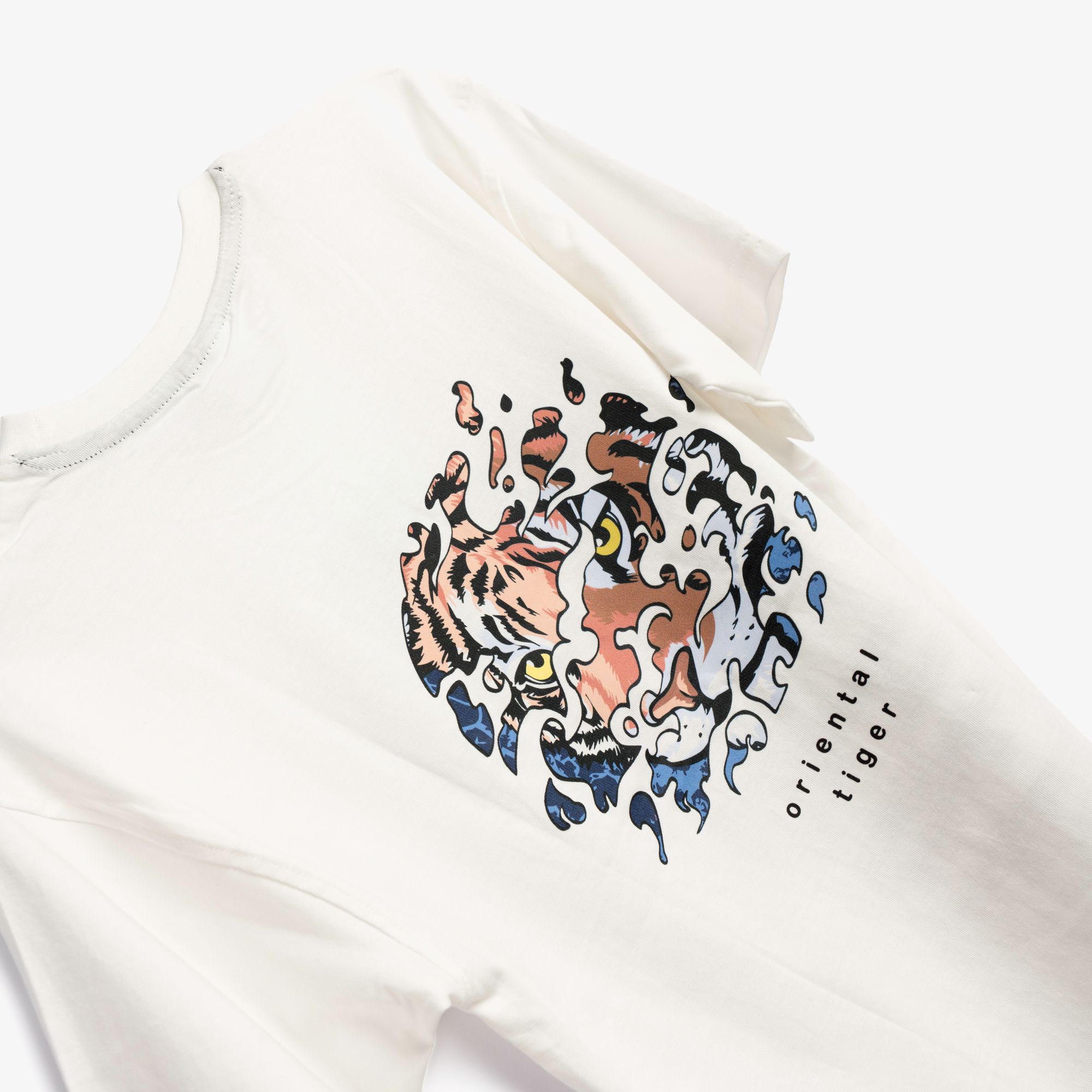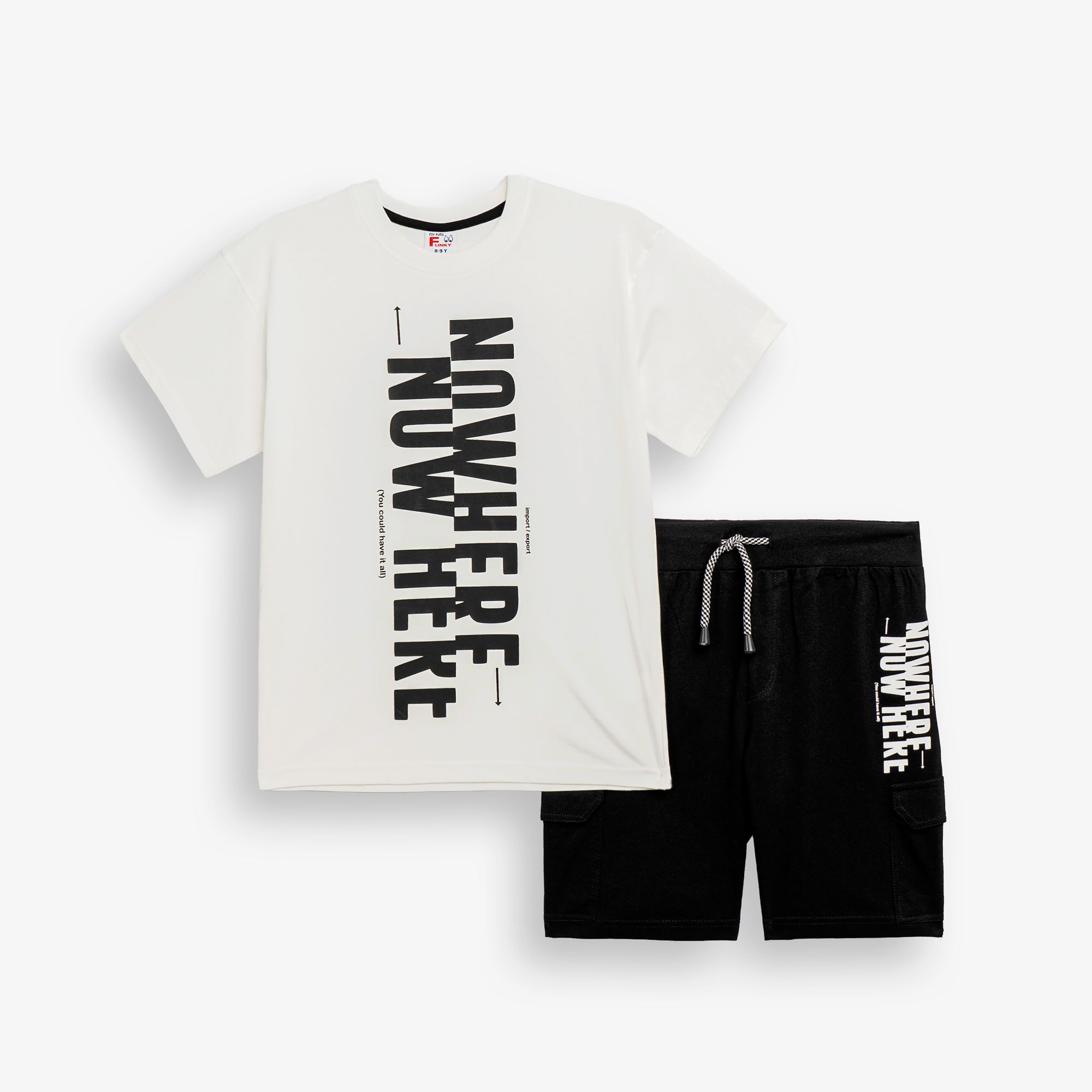 Σετ μακό κοντομάνικη μπλούζα με τύπωμα (nowhere και πίσω τίγρη) και βερμούδα φούτερ με τύπωμα σε χρώμα εκρού/μαύρο για αγόρι 6-16 ετών