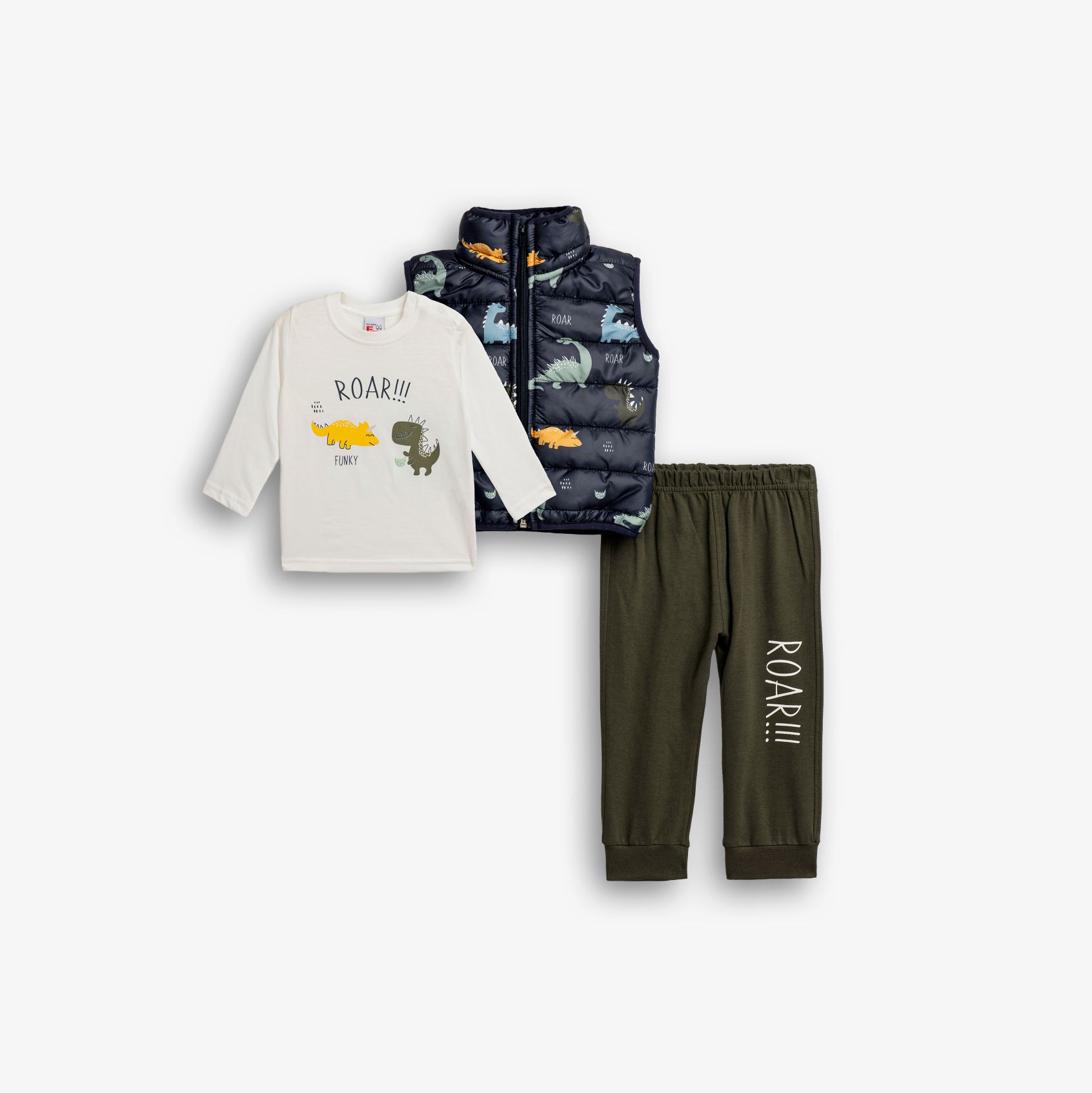 Σετ 3 τεμάχια τζάκετ αμάνικο με τύπωμα allover και μπλούζα μακρυμάνικη κάλτσα με τύπωμα (δεινόσαυροι) και παντελόνι φούτερ αχνούδιαστο με τύπωμα μπλέ/εκρού/χακί για αγόρι μηνών