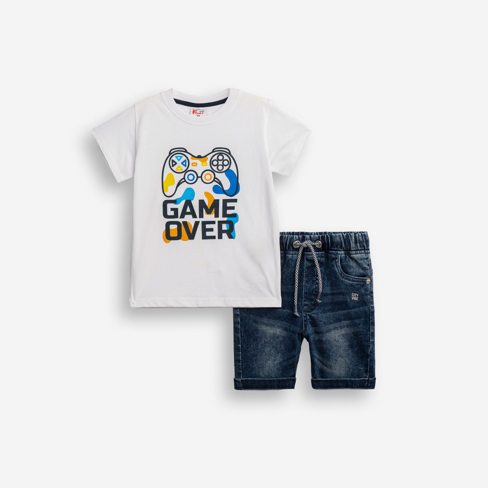 Σετ μπλούζα με τύπωμα (game over) και βερμούδα φούτερ τζίν πάνω από το γόνατο σε χρώμα λευκό/μπλέ τζίν για αγόρι 2-6 ετών