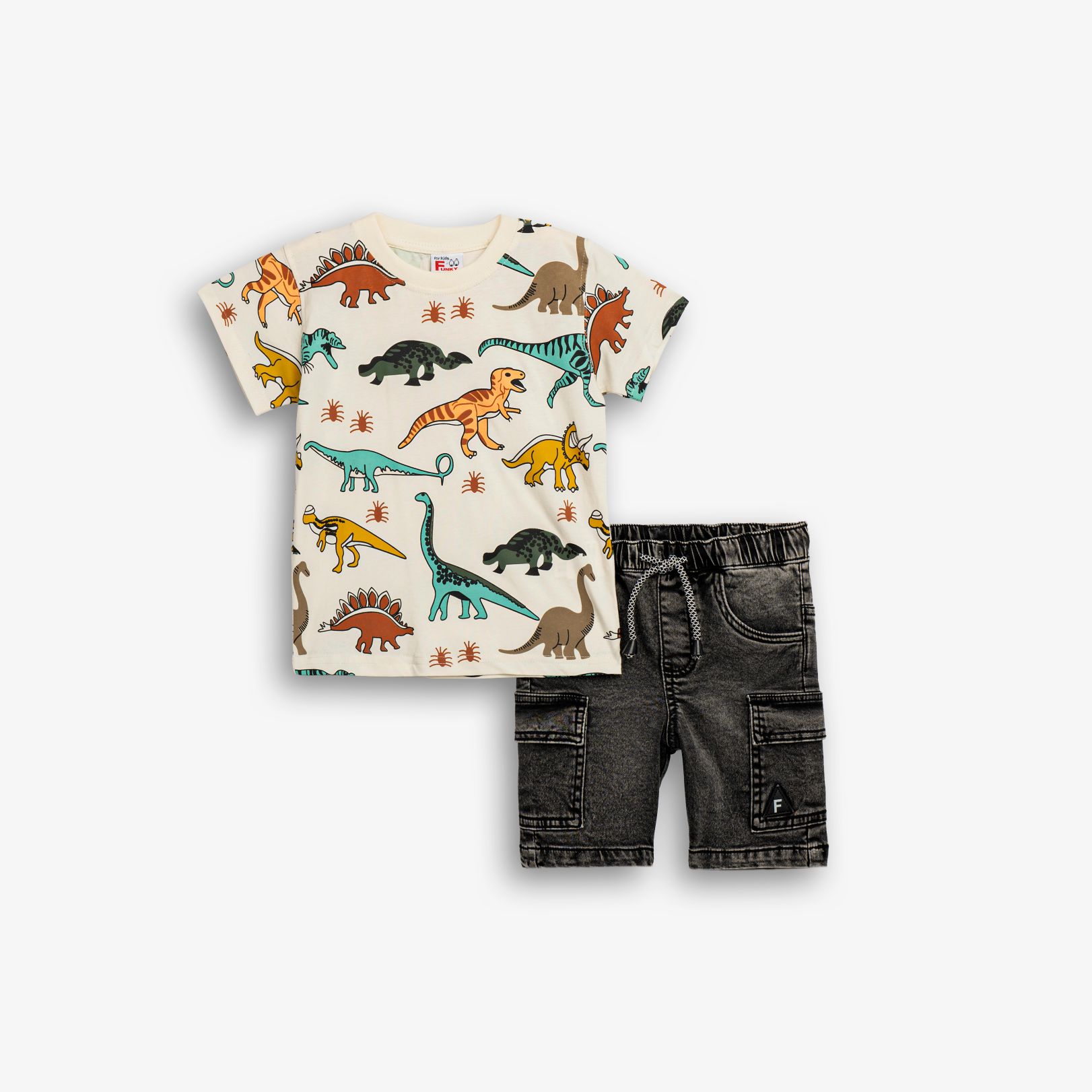 Σετ μπλούζα με τύπωμα (δεινόσαυροι) allover και βερμούδα φούτερ τζίν πάνω από το γόνατο σε χρώμα εκρού/μαύρο τζίν για αγόρι 2-6 ετών