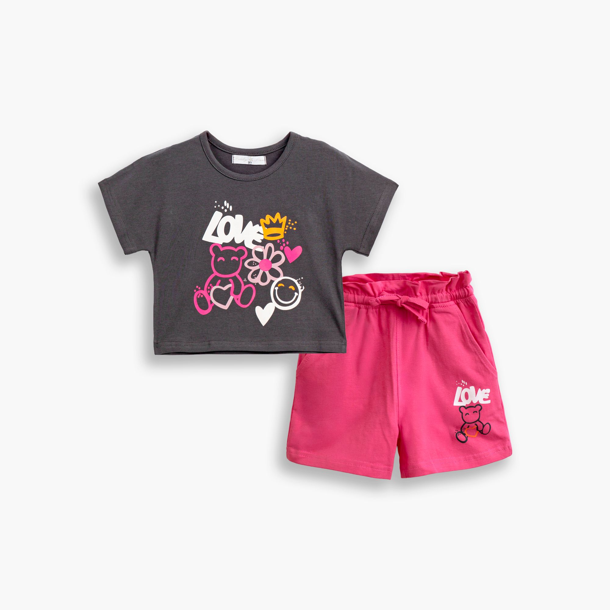 Σετ μπλούζα λύκρα με τύπωμα (διάφορα σχέδια) και βερμούδα με τύπωμα σε χρώμα ανθρακί/φλαμίνγκο ροζ για κορίτσι 2-6 ετών