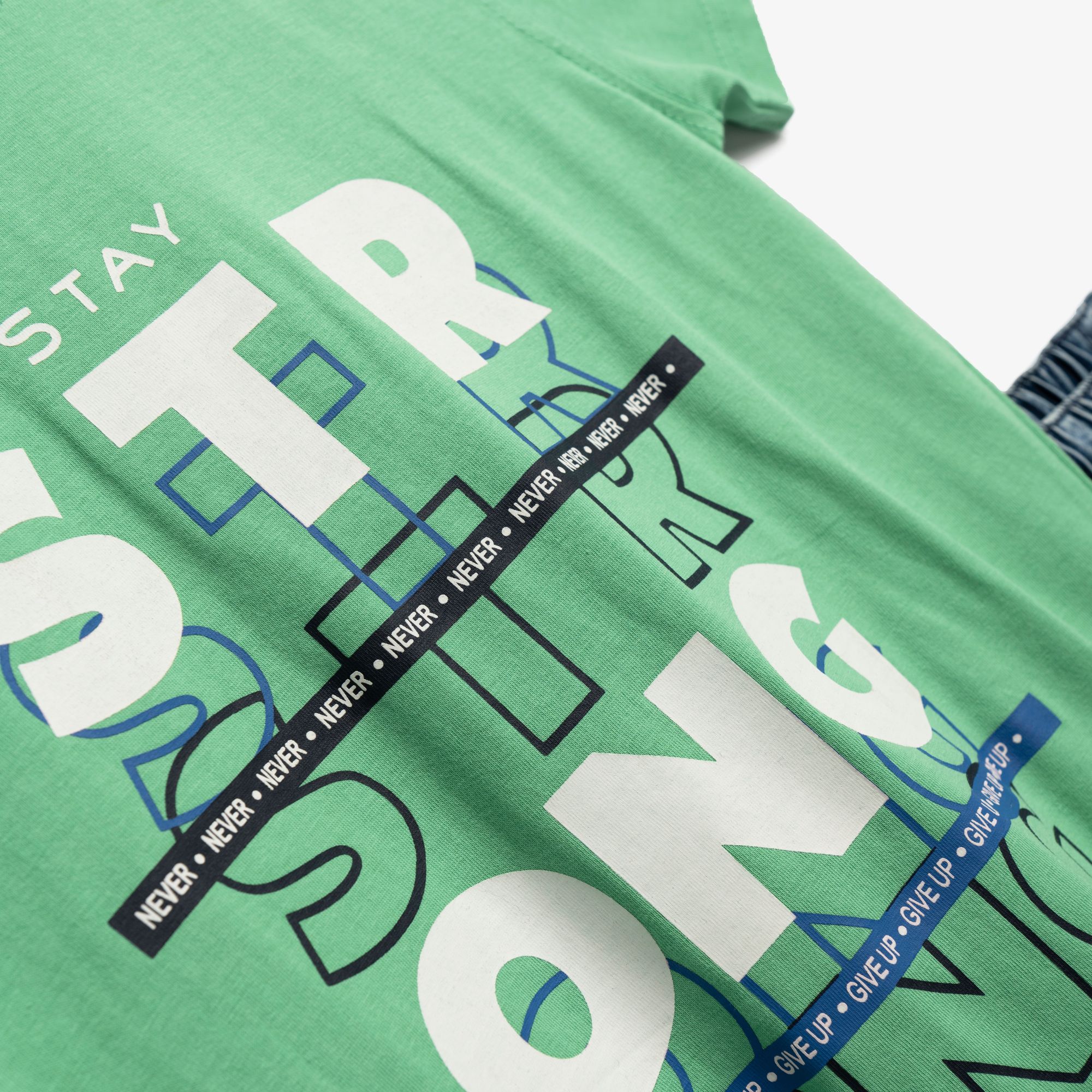 Σετ μπλούζα με τύπωμα (strong) και βερμούδα φούτερ τζίν σε χρώμα πράσινο παπαγάλου/μπλέ τζίν για αγόρι 6-16 ετών