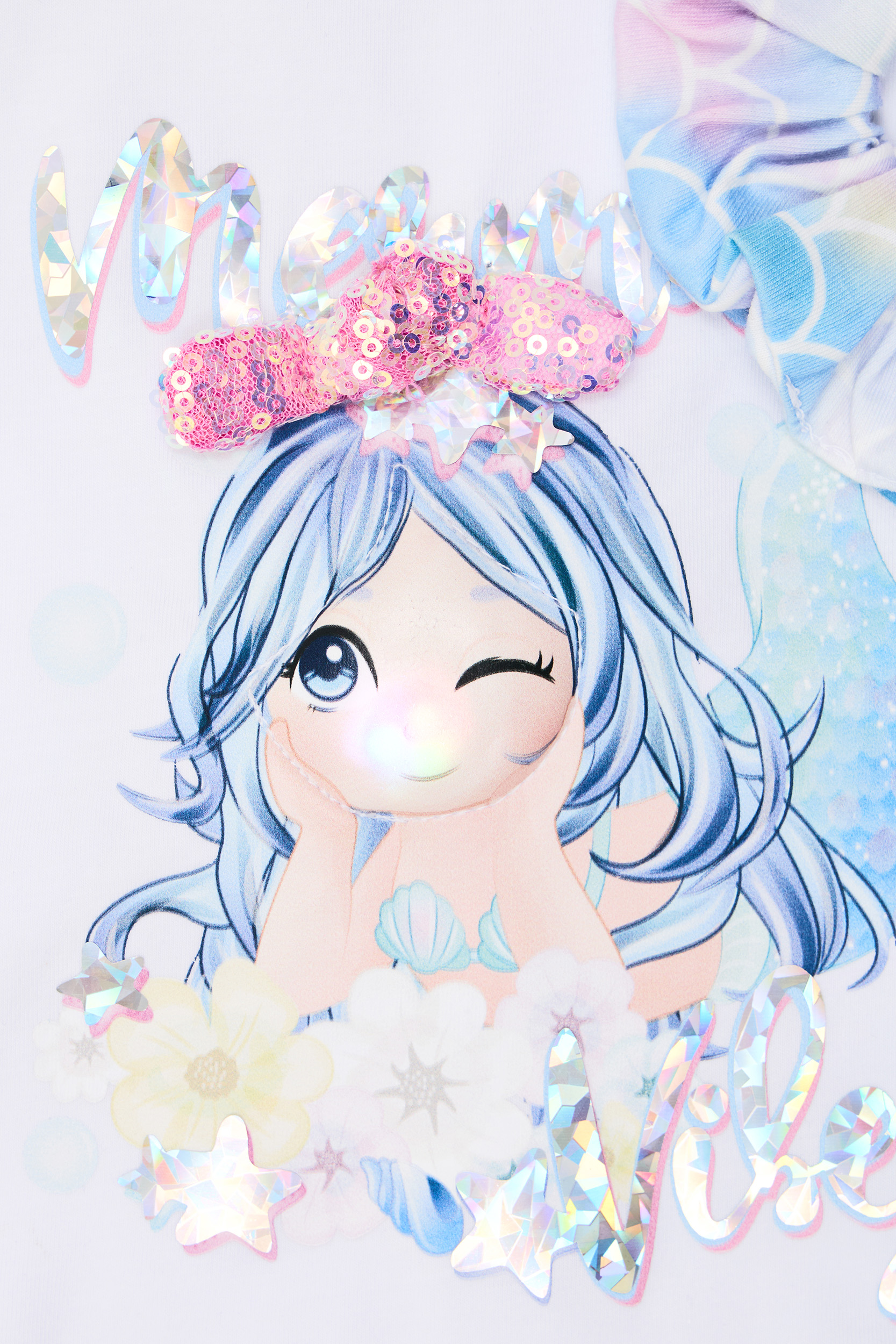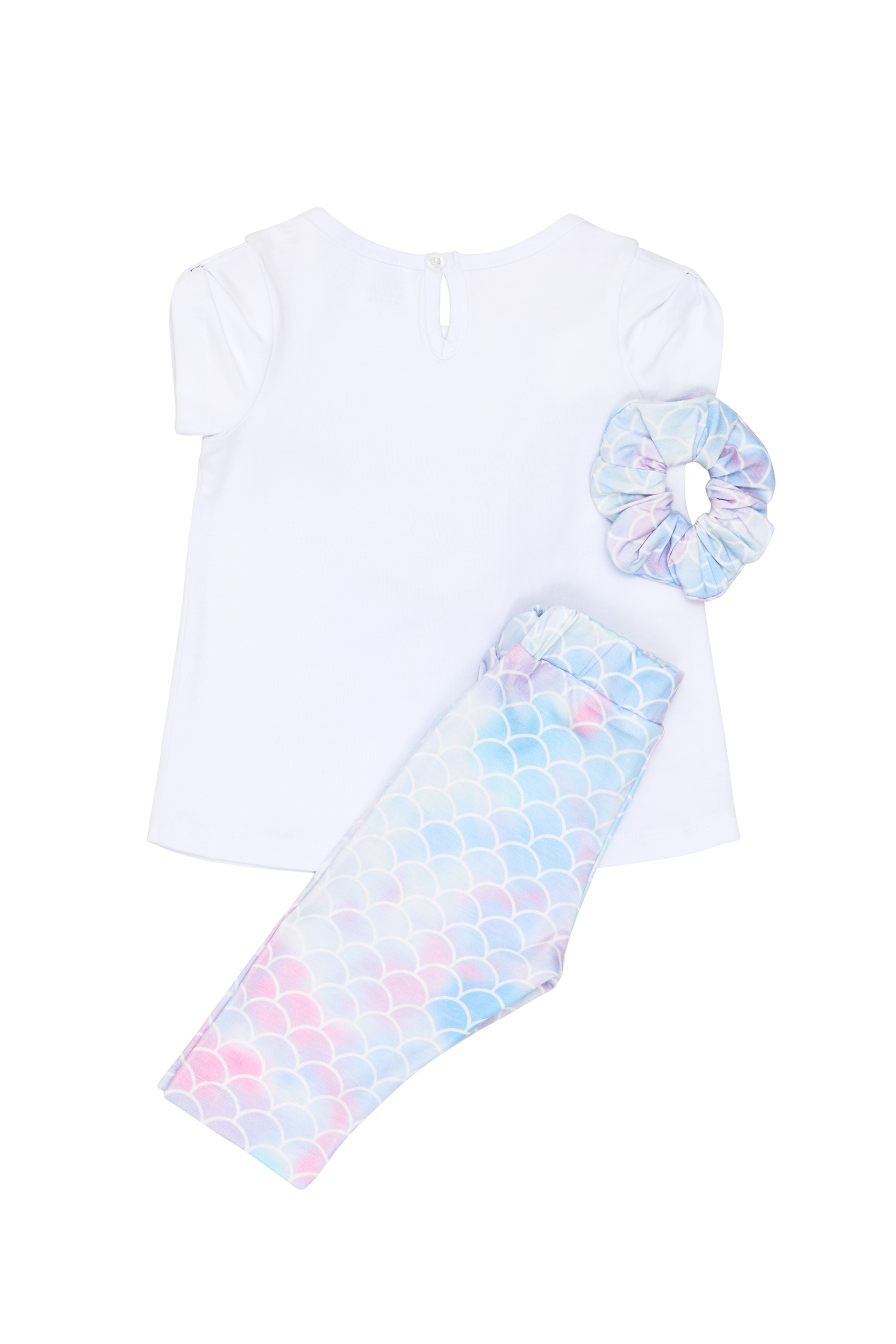 σετ μπλούζα με στάμπα γοργόνα και λαμπάκι στη μύτη της γοργόνας, καπρι κολάν σε σχεδιο λέπια γοργόνας και scrunchie μαλλιών