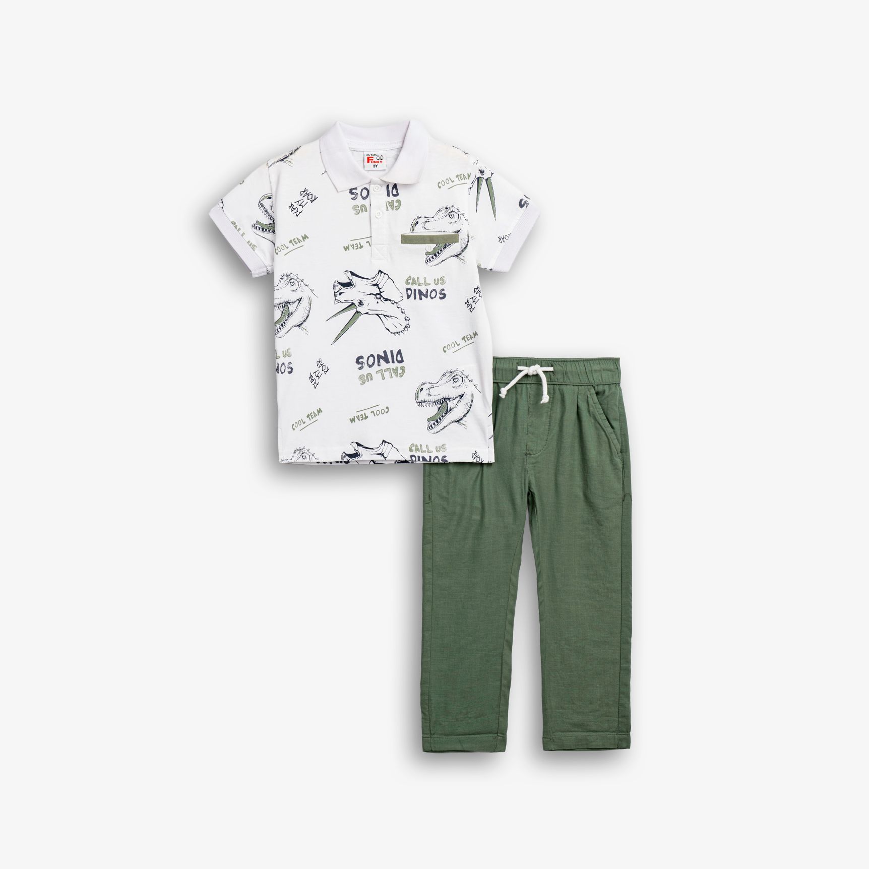 Σετ μπλούζα κοντομάνικη πόλο με τύπωμα (δεινόσαυροι) allover και παντελόνι σε χρώμα λευκό/ανοιχτό χακί για αγόρι 2-6 ετών